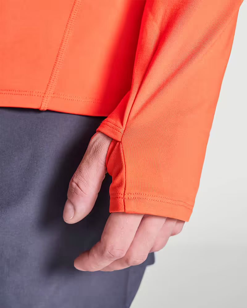 E se és daqueles que sai cedo ou volta tarde, aqui vem o melhor! Os detalhes refletores no pescoço e nas costas aumentam a tua visibilidade, para que treines com segurança mesmo em condições de pouca luz. Mãos frias? Os punhos com abertura para o polegar tratam disso, mantendo-as cobertas e as mangas sempre no lugar. Além disso, o interior felpudo, suave e quente protege-te do frio sem sufocar, mantendo uma respirabilidade ideal para qualquer atividade.